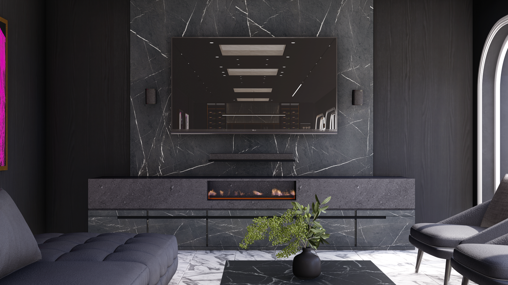 Mueble de T.V. con chimenea y base en mármol Carrara o Marquina.